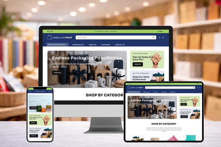 Emballage Tout migrated from Magento to Shopify to reduce technical overhead and simplify day-to-day management. Creative Cart handled the full rebuild, including data migration, redesign, Shopify setup, and ERP workflow alignment.